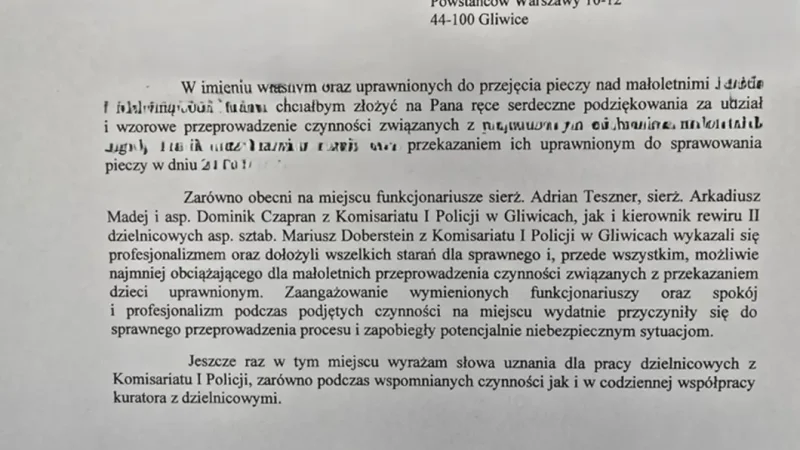Jak podkreślono w piśmie skierowanym do Komendanta Miejskiego Policji w Gliwicach, policjanci dołożyli wszelkich starań, aby przebieg czynności był sprawny, a przede wszystkim możliwie najmniej obciążający dla małoletnich. To właśnie ta troska o psychiczny komfort dzieci w i tak już trudnej dla nich sytuacji zasługuje na największe uznanie.