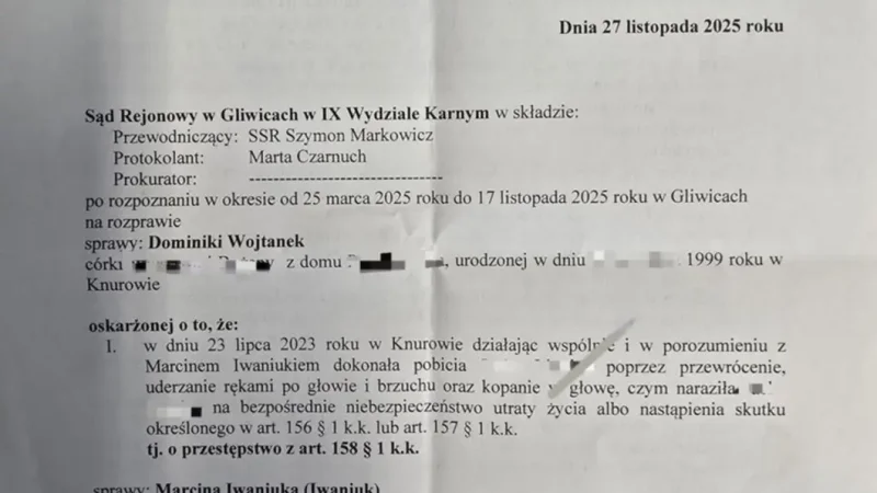 Gliwicka prokuratura może zapisać na swoim koncie kolejne zwycięstwo. Sąd Rejonowy w Gliwicach wydał wyrok skazujący w sprawie, która od miesięcy budziła spore emocje w lokalnej społeczności. Na ławie oskarżonych zasiedli Dominika Wojtanek i Marcin Iwaniuk, którym postawiono zarzut pobicia. Po przeprowadzeniu postępowania sąd nie miał wątpliwości – oboje zostali uznani za winnych popełnienia przestępstwa z art. 158 § 1 Kodeksu Karnego.