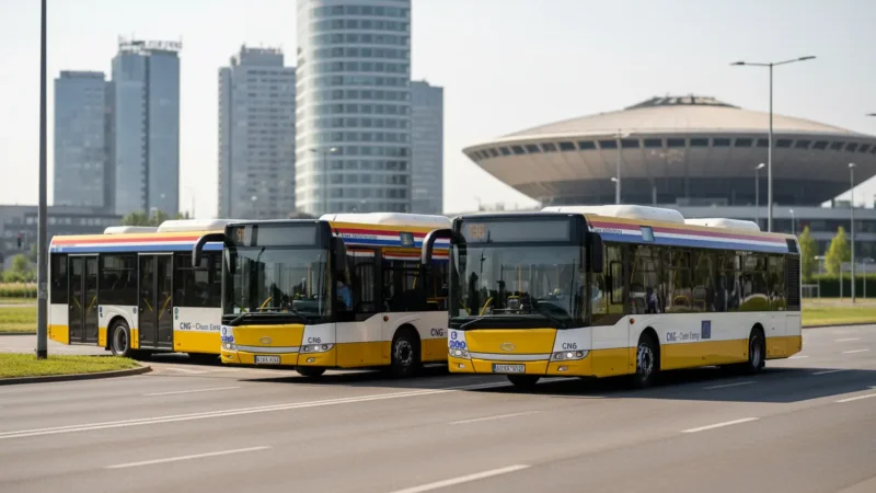 CNG (Compressed Natural Gas) to sprężony gaz ziemny wykorzystywany jako paliwo do pojazdów. Jest to jedno z najbardziej ekologicznych rozwiązań w transporcie publicznym. Autobusy zasilane CNG emitują znacznie mniej szkodliwych substancji niż ich odpowiedniki z silnikami diesla – o około 70-90% mniej tlenków azotu i praktycznie nie wytwarzają pyłów zawieszonych PM10 i PM2,5, które są szczególnie szkodliwe dla zdrowia mieszkańców.