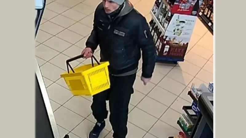 Na opublikowanych zdjęciach widać mężczyznę z koszykiem na zakupy, który pozornie zachowuje się jak zwykły klient. To właśnie takie pozornie niewinne zachowanie miało zmylić pracowników sklepu i umożliwić sprawcom bezproblemowe wyniesienie towaru.
